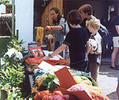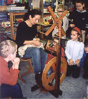 Vorführung des Spinnens an Handspindel und Spinnrad.